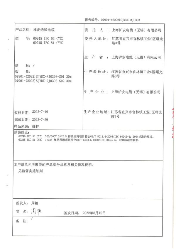 上海沪安电缆(无锡)有限公司/ 国家强制性产品认证试验报告